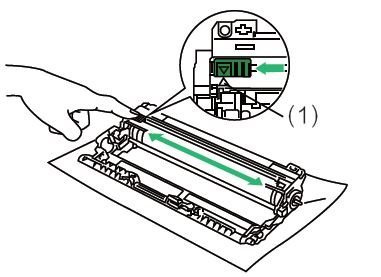 6. Gently slid the tab from right to left and left to right several times to clean the corona wire. Return the tab to the home position as the picture shows.